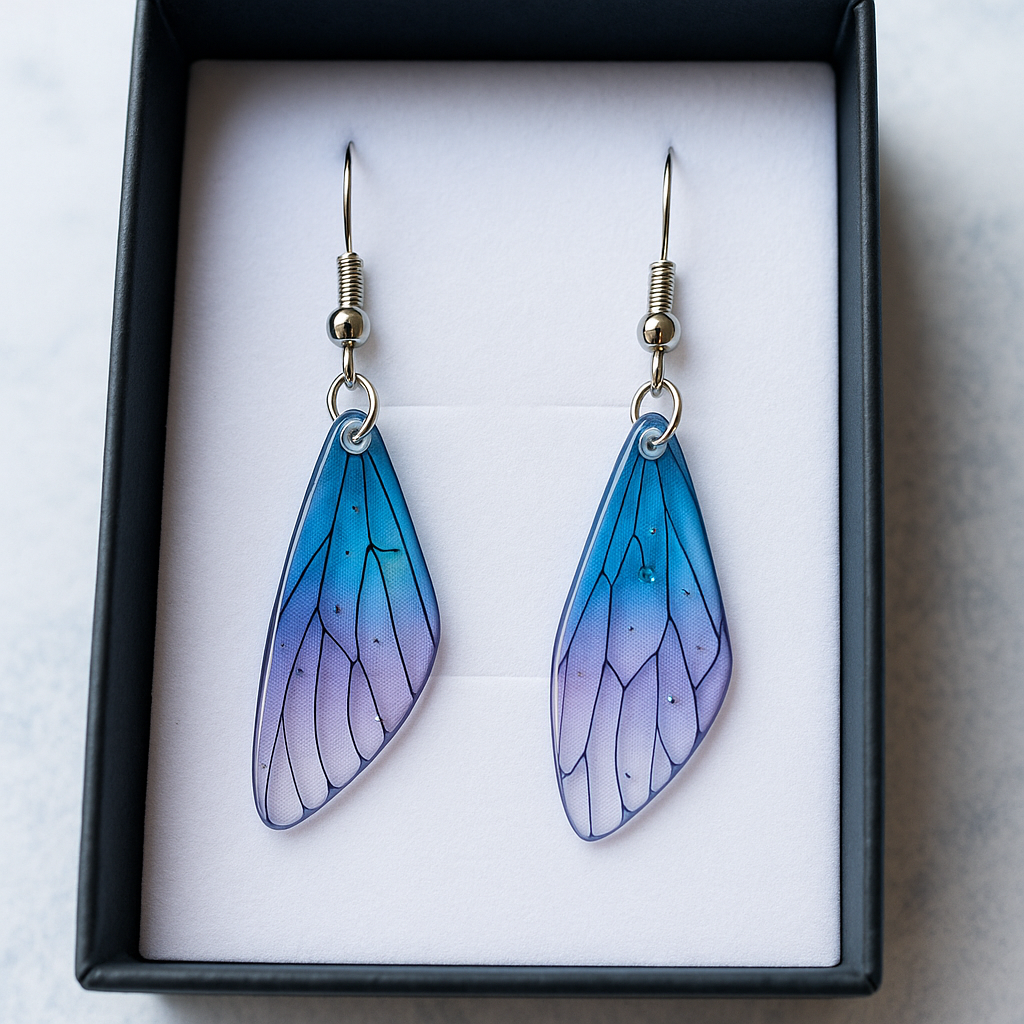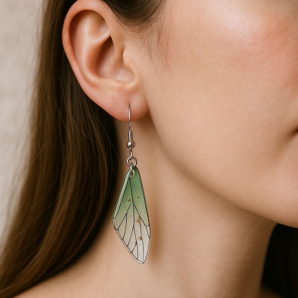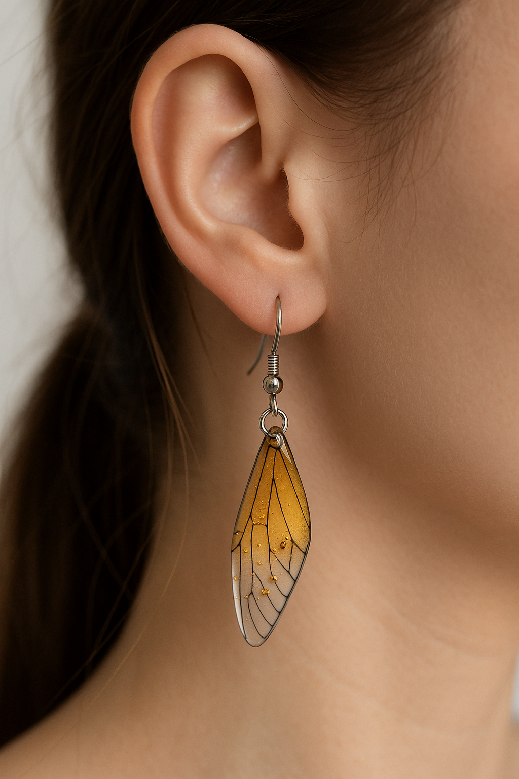 Zarte, handgemachte Feenflügel Ohrringe für alle, die dezente Eleganz mit einem Hauch Magie lieben. Diese federleichten Schmuckstücke aus hochwertigem Acryl sind mit echten Blattgold-Details veredelt, die im Licht geheimnisvoll schimmern. Ideal als Alltags-Ohrringe oder als besonderes Geschenk für Natur- & Fantasy-Liebhaber.