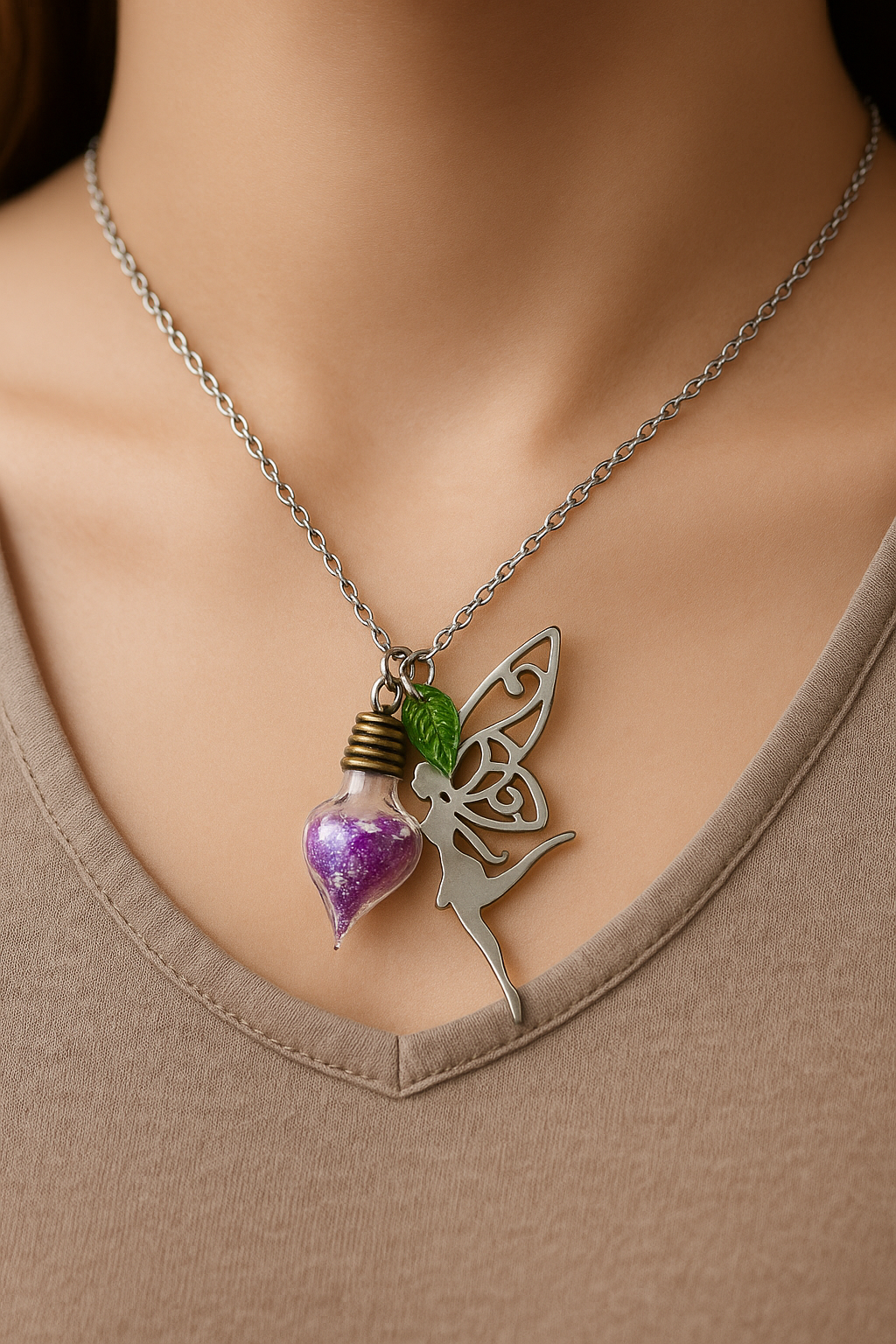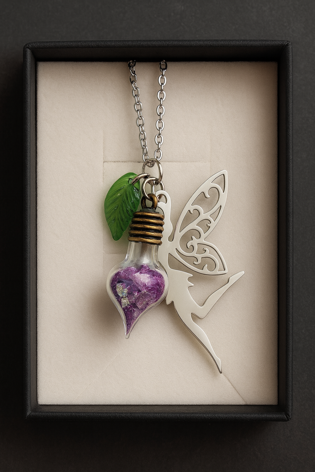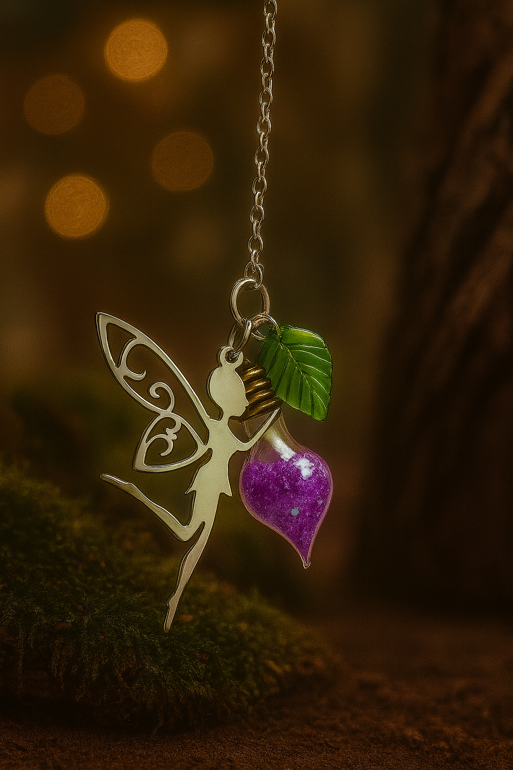 Trage deine Träume bei dir – mit der Feenstaub-Phiole „Traumfee“. Gefüllt mit schimmerndem, violettem Feenstaub, der im Dunkeln und unter UV-Licht magisch leuchtet, begleitet dich dieses Amulett als Schutzsymbol, Kraftspender & Glücksbringer.