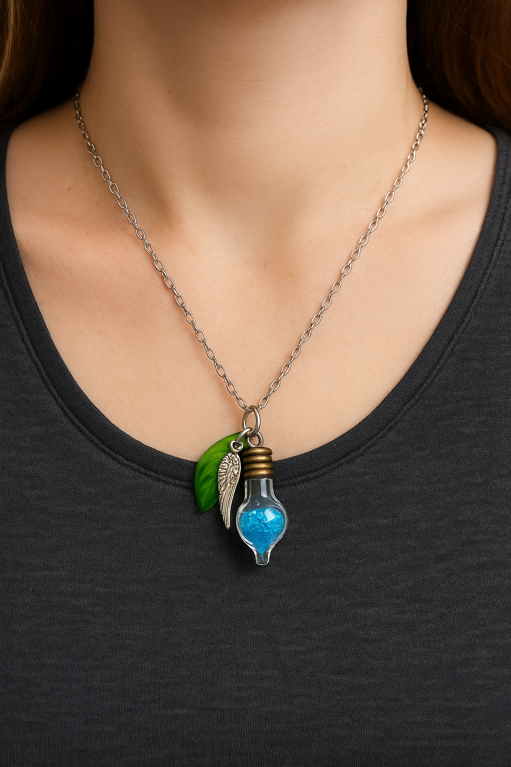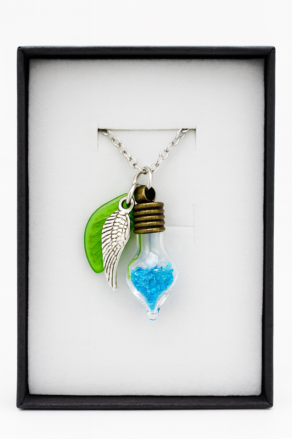 Trage deine Wünsche immer bei dir – mit der zarten Glücksphiole „Wunschfee“, gefüllt mit hellblauem, leuchtendem Feenstaub. Dieser magische Anhänger begleitet dich als Talisman für Hoffnung, innere Ruhe & vertrauensvolle Neuanfänge.