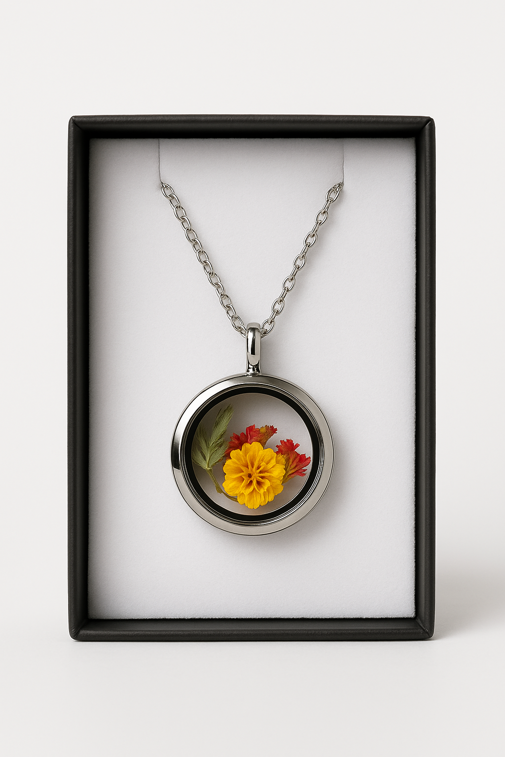 Bringe ein Stück Natur in deinen Alltag – mit dieser eleganten Edelstahlkette mit handgefertigtem Trockenblumen-Amulett. Der runde Anhänger (25 mm) enthält echte, sorgfältig getrocknete Blumen in zarten Naturfarben. Eingefasst in robustem Edelstahl und geschützt von klarem Glas, bleibt die natürliche Schönheit der Blüten dauerhaft erhalten.