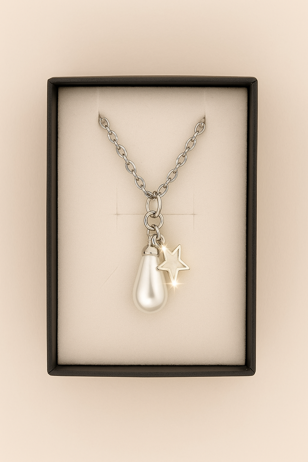 Dieser elegante Schmuck vereint einen zarten Perlen-Tropfen mit einem filigranen Sternen-Charm in silbernem Glanz. Schlicht und doch voller Magie – wie ein kleiner Lichtstrahl, eingefangen aus der Welt der Feen.
