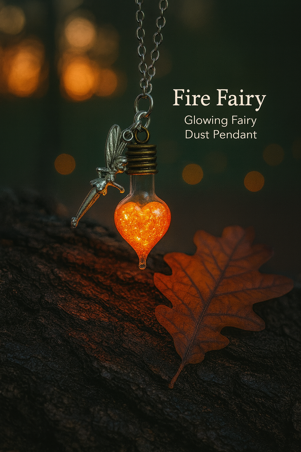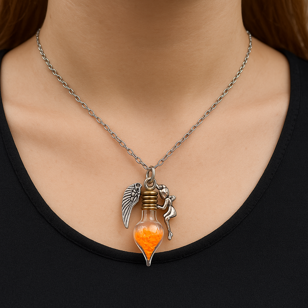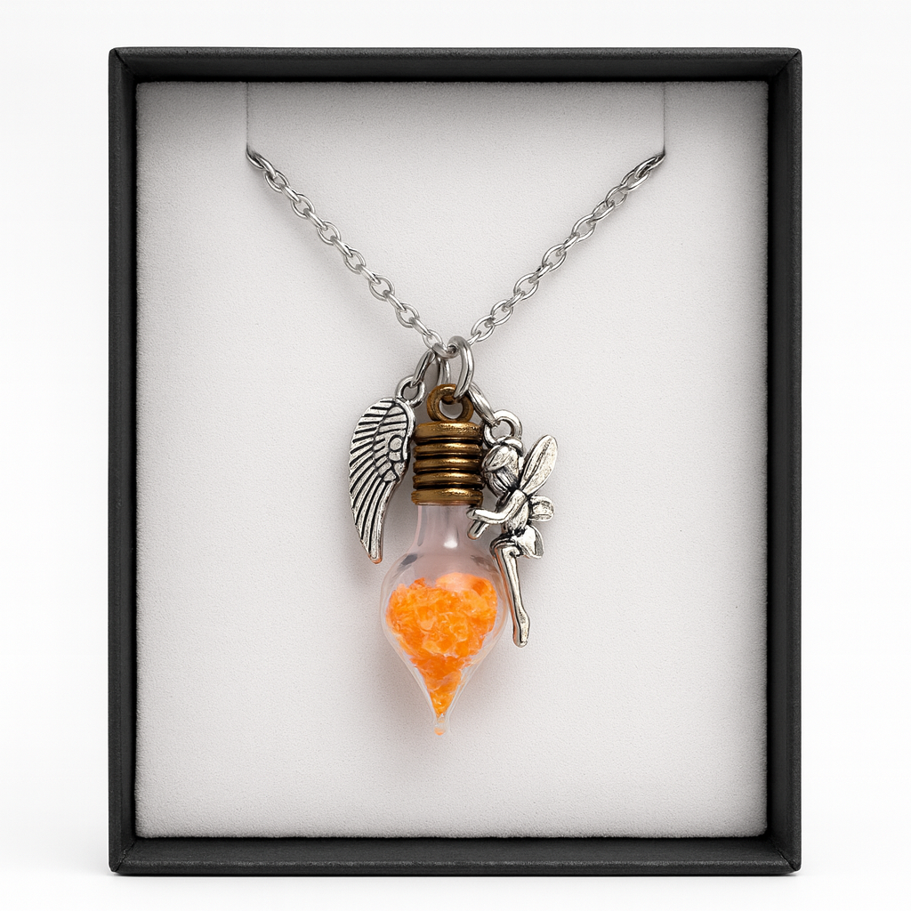 Gefüllt mit intensiv orangefarbenem Feenstaub, der im Dunkeln und unter UV-Licht leuchtet, erinnert dich diese Kette täglich daran: